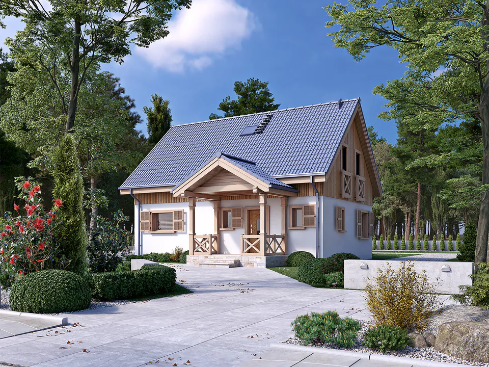 Dom Aksamitka 110m2, to wygodny dom drewniany z poddaszem, który może być zarówno całorocznym jak i letniskowym budynkiem. Konstrukcja szkieletowa, w pełni drewniana. Na parterze znajduje się pokój dzienny, kuchnia, sypialnia, łazienka oraz pomieszczenie gospodarcze Na poddaszu trzy sypialnie, salonik oknem trójkątnym oraz łazienka. Tradycyjny, klasycznie wyglądający dom. Z dużą, niezwykle jasną strefą dzienną, która otwarta jest na trzy strony świata. Zadaszony taras to idealne miejsce do wypoczynku.