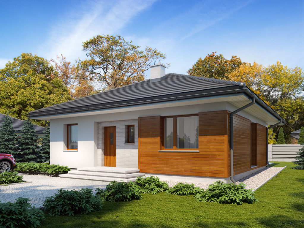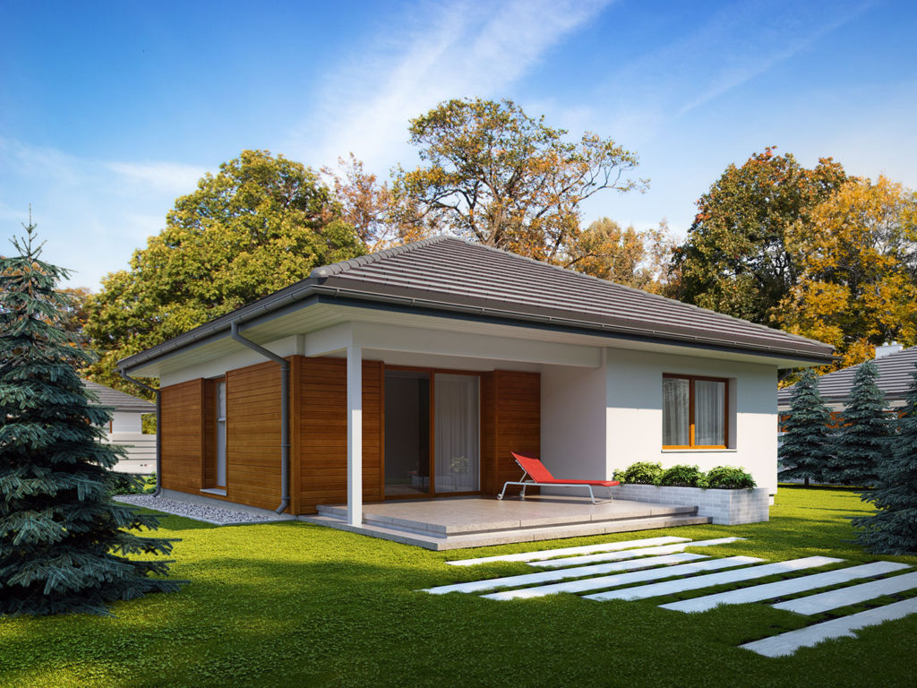 Dom Elsa 75m2, to projekt zapewniający optymalne potrzeby 3-4-osobowej rodziny. Jest to dom bardzo funkcjonalny z wyraźnym podziałem na strefy. Przestronna część dzienna to proste i klasyczne połączenie salonu, jadalni i kuchni, zaś strefa intymna składa się z 2 sypialni i łazienki. Plusem projektu jest dodatkowe pomieszczenie gospodarcze, które można przeznaczyć na pralnię lub spiżarnię. Dom posiada duży taras umożliwiający spędzanie czasu na świeżym powietrzu niezależnie od warunków pogodowych.