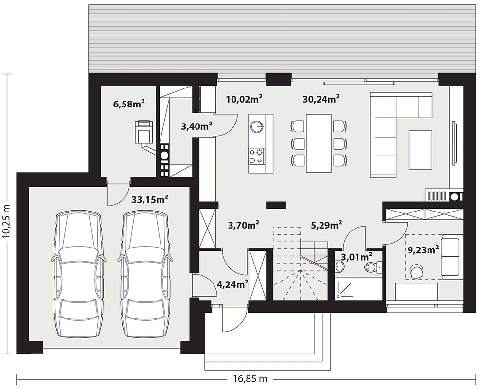 Kiri 2 to dom parterowy z użytkowym poddaszem. Atutem tego domu jest ciekawa, otwarta część dzienna, bardzo dobrze doświetlona dzięki ogromnym przeszkleniom. Taka aranżacja kuchni, salonu i jadalni sprawia, że wydają się one jeszcze większe, a krajobraz z zewnątrz staje się nieodzowną częścią wnętrza. Pasjonatom gotowania na pewno spodoba się wygodna, nowoczesna kuchnia dopełniona praktyczną, dużą spiżarnią. Funkcjonalny program parteru uzupełnia jeszcze gabinet, łazienka, duża kotłownia oraz dwustanowiskowy garaż. Szerokie, wygodne schody prowadzą na poddasze gdzie znajdują się 3 sypialnie. Największa z nich posiada własną łazienkę i garderobę. Całość funkcjonalną poddasza dopełnia wspólna łazienka i pralnia.