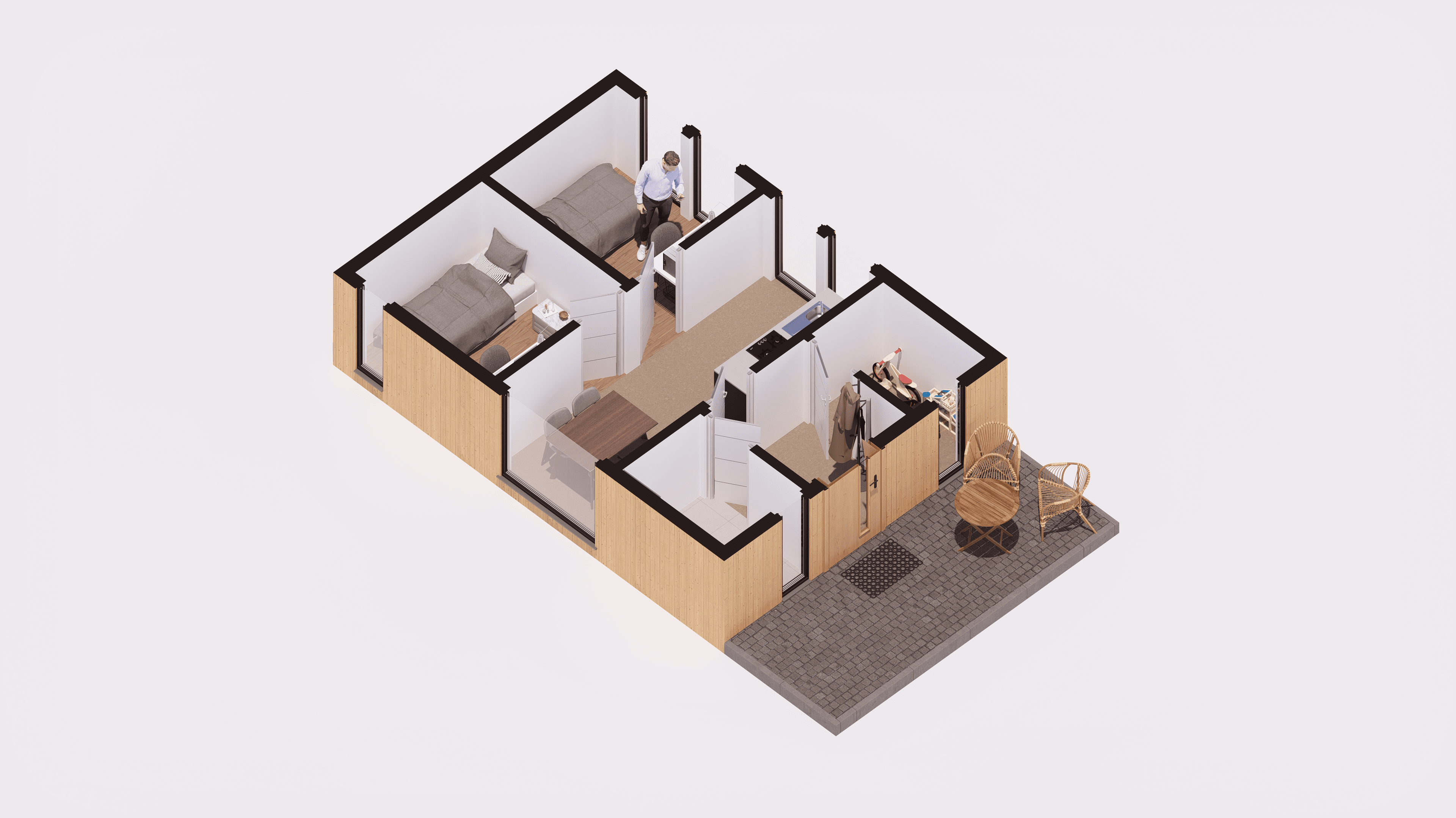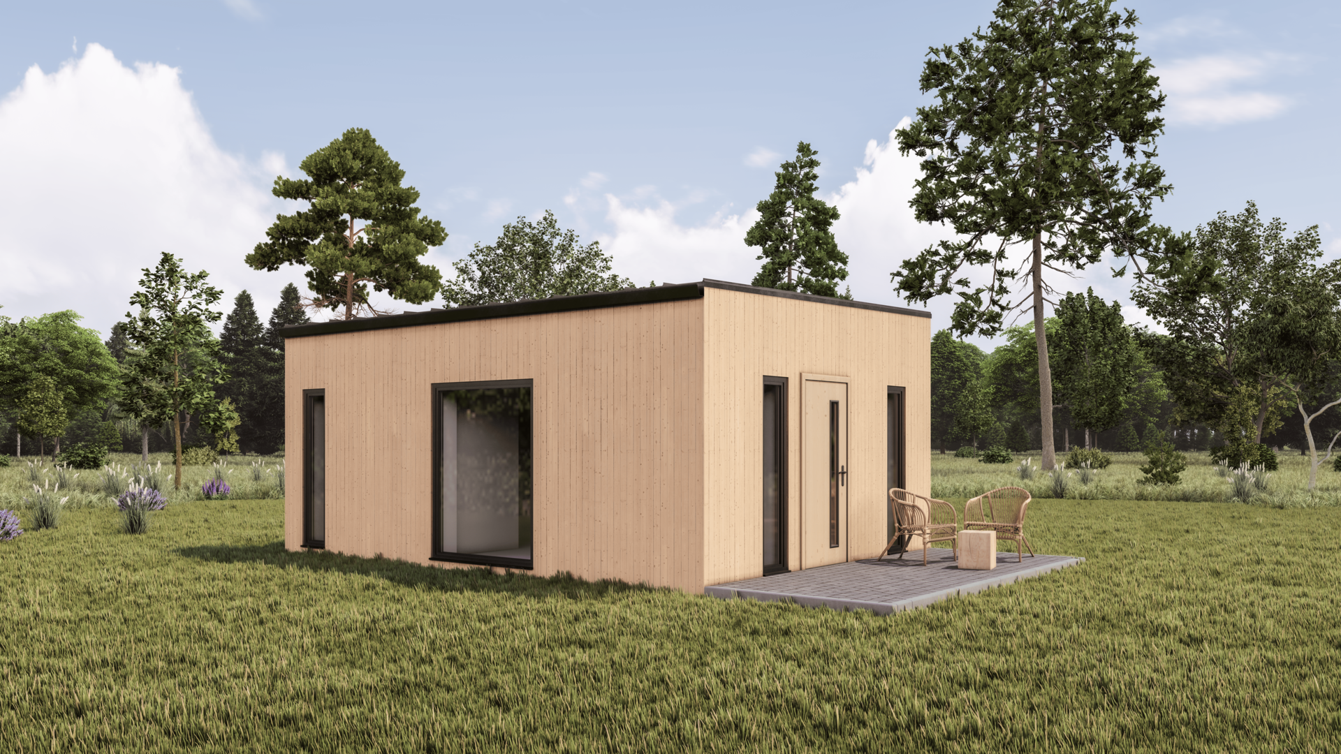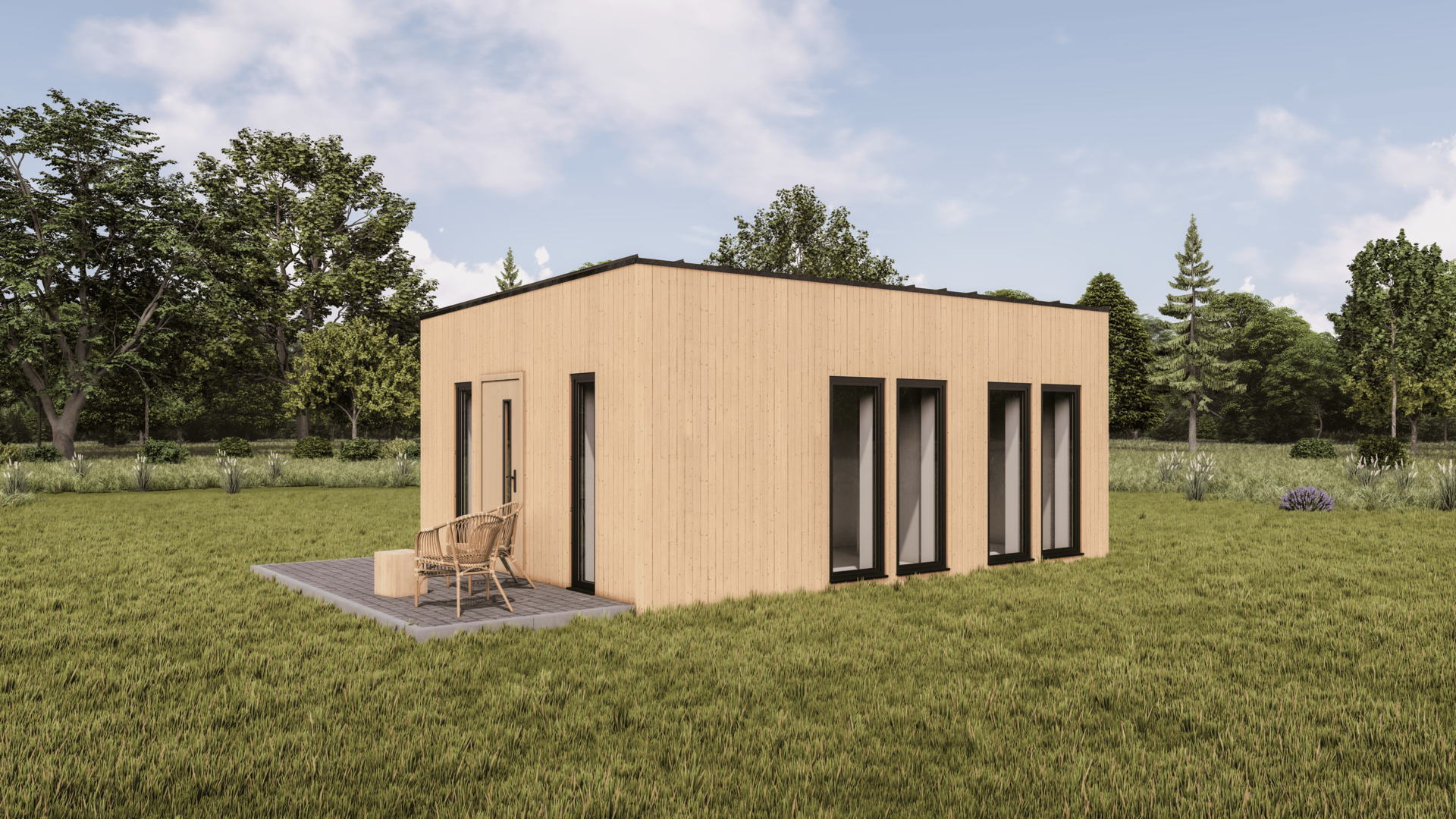 Dom Modułowy o powierzchni 35m2 to kompaktowy i przystępny cenowo dom modułowy o powierzchni użytkowej ok 30m2, który mieści przedsionek, kuchnię, łazienkę, dwa pokoje oraz pomieszczenie gospodarcze. Solidna szkieletowa konstrukcja z certyfikowanego drewna, ocieplenie wełną mineralną oraz trzyszybowe okna zapewniają trwałość i komfort. Dom wykończony jest deską elewacyjną, a przy domu znajduje się taras z drewna świerkowego. Możliwa jest dowolna zmiana układu wnętrza bez dodatkowych opłat